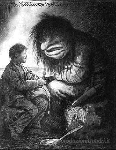 Ti offriamo una riproduzione artigianale su tela dell'opera famosa 'Askeladden Og Trollet' di Theodor Severin Kittelsen, dal Museo delle Riproduzioni.