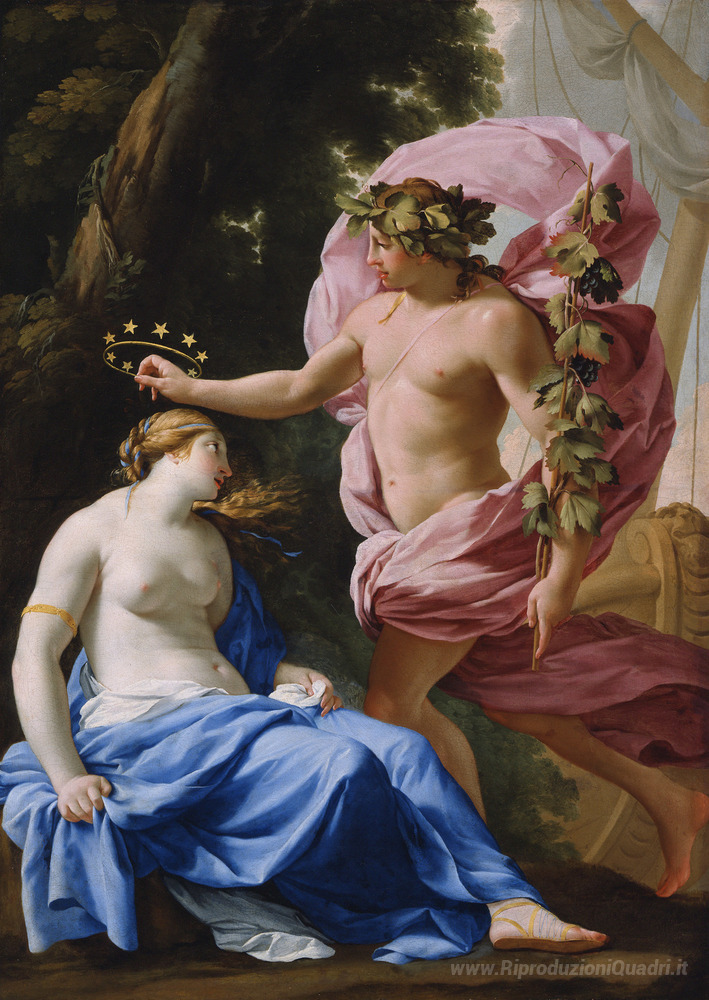 Ti offriamo una riproduzione artigianale su tela dell'opera famosa 'Bacco e Arianna' di Eustache Le Sueur, dal Museo delle Riproduzioni.