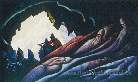 Ti offriamo una riproduzione artigianale su tela dell'opera famosa 'Bogatyrs svegliato' di Nicholas Roerich, dal Museo delle Riproduzioni.