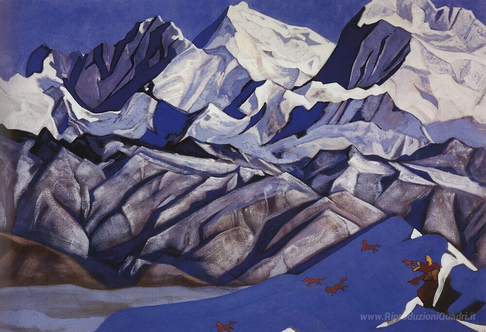 Ti offriamo una riproduzione artigianale su tela dell'opera famosa 'Cavalli rossi' di Nicholas Roerich, dal Museo delle Riproduzioni.