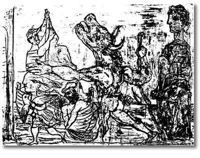 Ti offriamo una riproduzione artigianale su tela dell'opera famosa 'Cieco Minotauro è guidata da ragazza' di Pablo Picasso, dal Museo delle Riproduzioni.