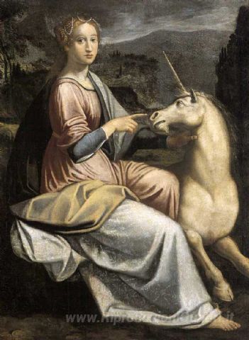 Ti offriamo una riproduzione artigianale su tela dell'opera famosa 'Dama con L'Unicorno' di Barbara Longhi, dal Museo delle Riproduzioni.