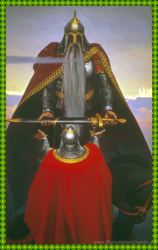 Ti offriamo una riproduzione artigianale su tela dell'opera famosa 'Dono di Svjatogor' di Konstantin Vasilyev, dal Museo delle Riproduzioni.