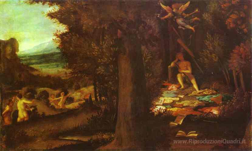 Ti offriamo una riproduzione artigianale su tela dell'opera famosa 'Dormire Apollo, Muse e Fama' di Lorenzo Lotto, dal Museo delle Riproduzioni.