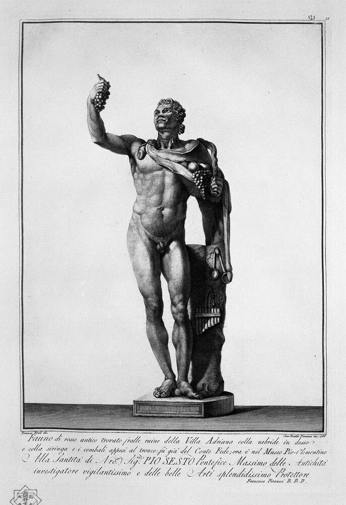 Ti offriamo una riproduzione artigianale su tela dell'opera famosa 'Fauno con l'uva' di Giovanni Battista Piranesi, dal Museo delle Riproduzioni.