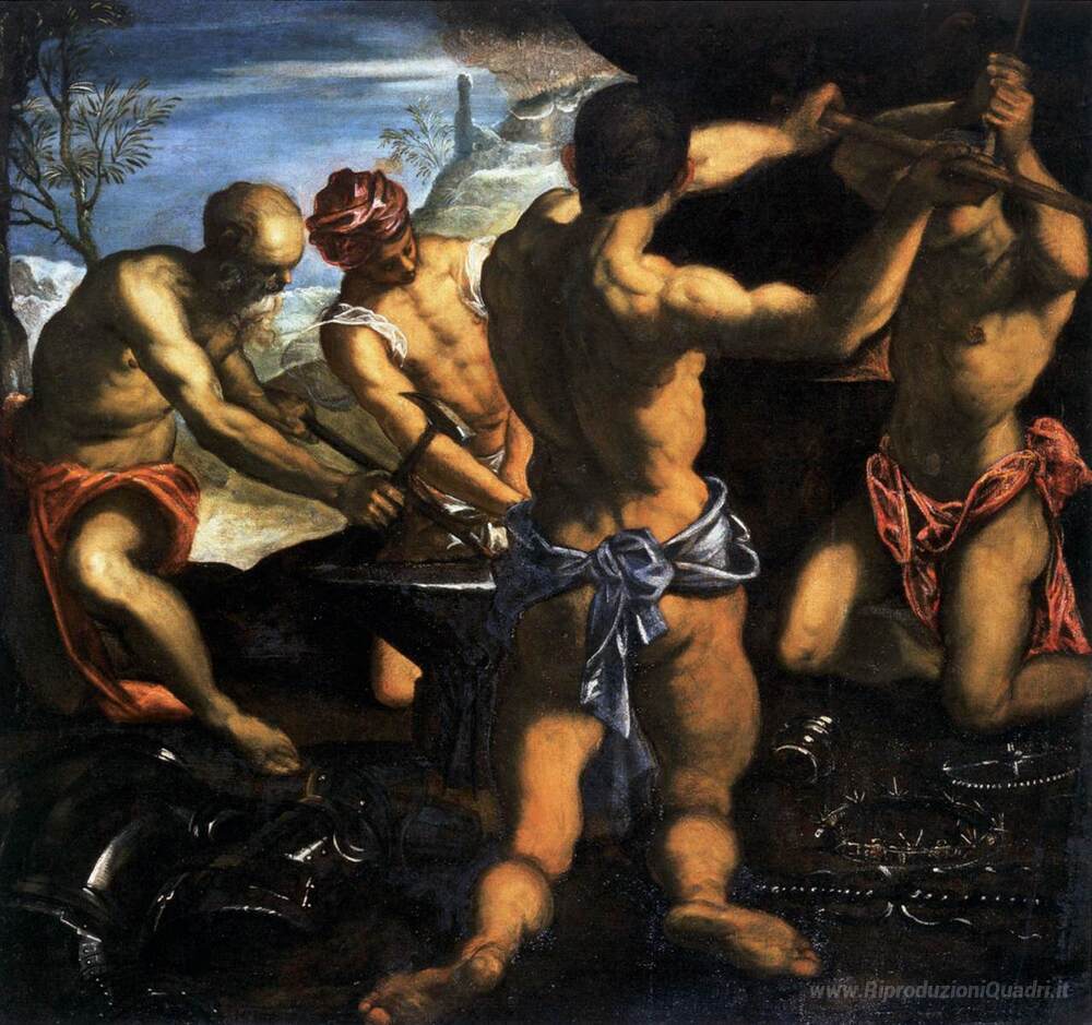 Ti offriamo una riproduzione artigianale su tela dell'opera famosa 'Fornace di Vulcano' di Tintoretto, dal Museo delle Riproduzioni.