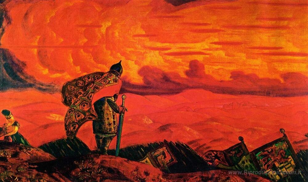 Ti offriamo una riproduzione artigianale su tela dell'opera famosa 'Frecce di sky - lance di terreno' di Nicholas Roerich, dal Museo delle Riproduzioni.