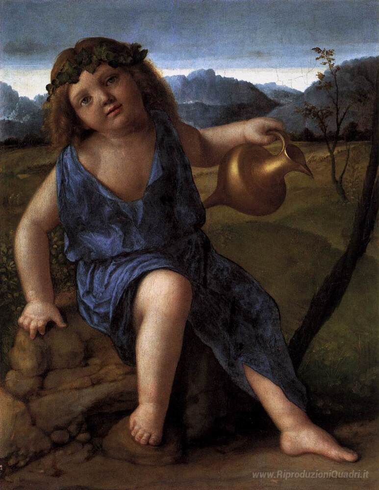Ti offriamo una riproduzione artigianale su tela dell'opera famosa 'Giovani Bacco' di Giovanni Bellini, dal Museo delle Riproduzioni.