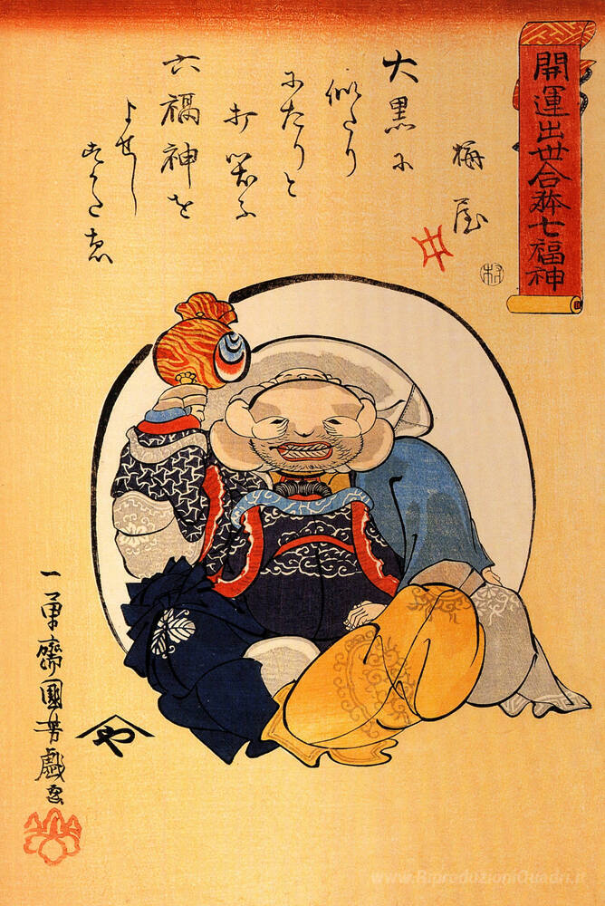 Ti offriamo una riproduzione artigianale su tela dell'opera famosa 'Hotei' di Utagawa Kuniyoshi, dal Museo delle Riproduzioni.