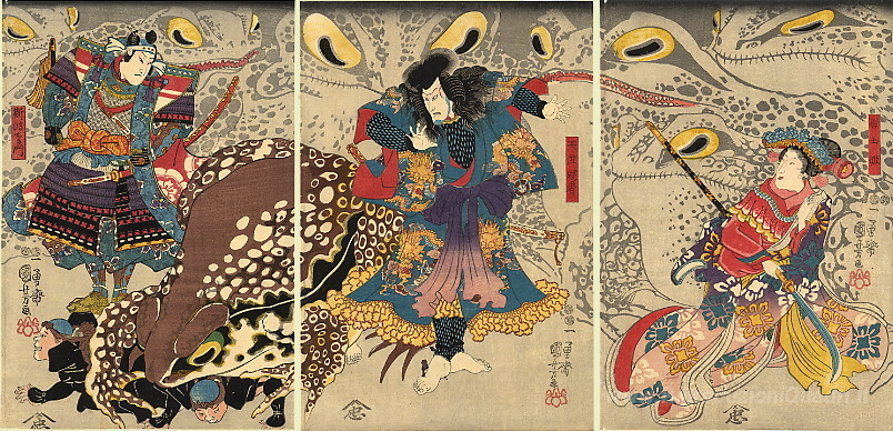 Ti offriamo una riproduzione artigianale su tela dell'opera famosa 'I rospi Magia' di Utagawa Kuniyoshi, dal Museo delle Riproduzioni.