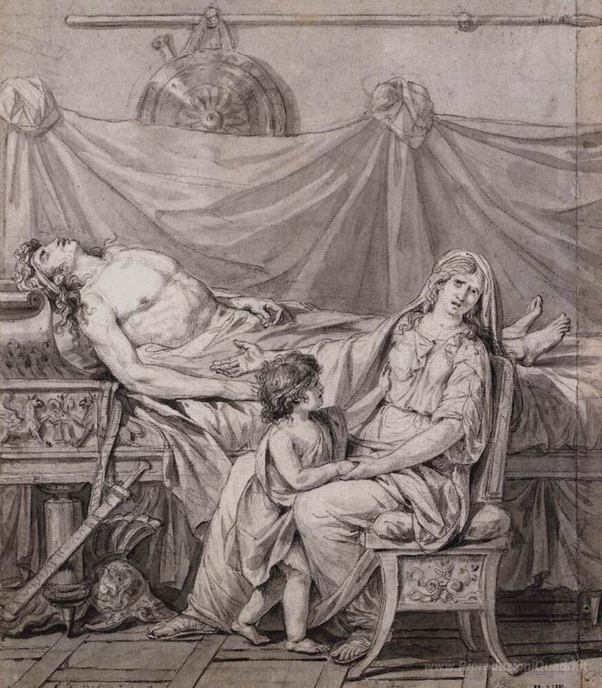 Ti offriamo una riproduzione artigianale su tela dell'opera famosa 'Il dolore di Andromaca' di Jacques-Louis David, dal Museo delle Riproduzioni.