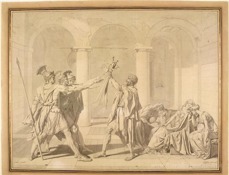 Ti offriamo una riproduzione artigianale su tela dell'opera famosa 'Il giuramento degli Orazi, secondo David' di Jean Auguste Dominique Ingres, dal Museo delle Riproduzioni.