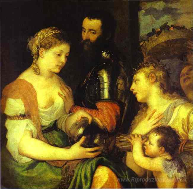 Ti offriamo una riproduzione artigianale su tela dell'opera famosa 'Il matrimonio con Vesta e Imene come Protettori e consiglieri de' di Titian, dal Museo delle Riproduzioni.
