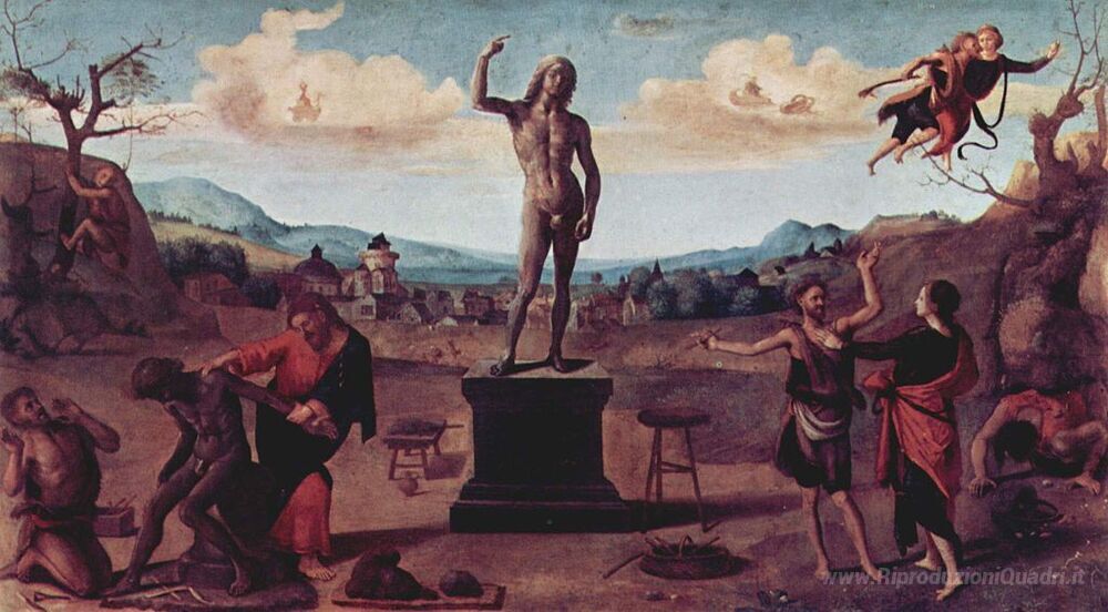 Ti offriamo una riproduzione artigianale su tela dell'opera famosa 'Il mito di Prometeo' di Piero di Cosimo, dal Museo delle Riproduzioni.
