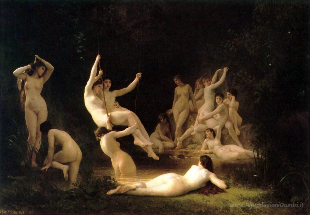 Ti offriamo una riproduzione artigianale su tela dell'opera famosa 'Il Ninfeo' di William-Adolphe Bouguereau, dal Museo delle Riproduzioni.