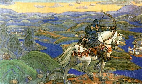 Ti offriamo una riproduzione artigianale su tela dell'opera famosa 'Il'ja Muromec' di Nicholas Roerich, dal Museo delle Riproduzioni.