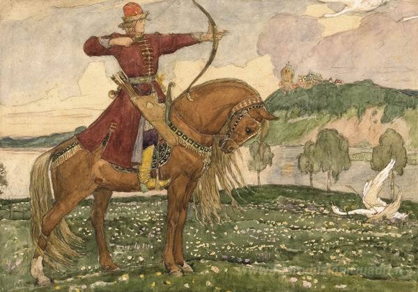 Ti offriamo una riproduzione artigianale su tela dell'opera famosa 'Ivan e il Cigno' di Viktor Vasnetsov, dal Museo delle Riproduzioni.