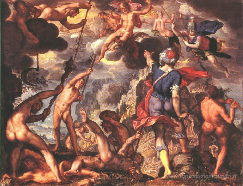 Ti offriamo una riproduzione artigianale su tela dell'opera famosa 'La battaglia tra gli dei ei Titani' di Joachim Wtewael, dal Museo delle Riproduzioni.