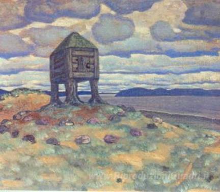 Ti offriamo una riproduzione artigianale su tela dell'opera famosa 'La capanna di Dead' di Nicholas Roerich, dal Museo delle Riproduzioni.
