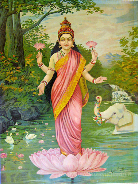 Ti offriamo una riproduzione artigianale su tela dell'opera famosa 'Lakshmi, la dea della ricchezza' di Raja Ravi Varma, dal Museo delle Riproduzioni.