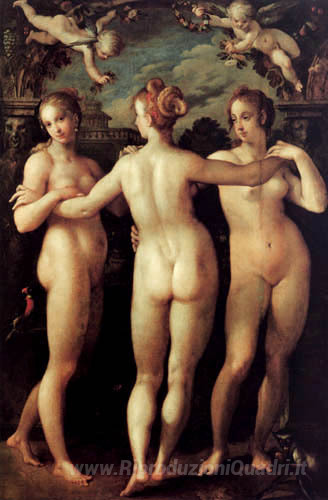 Ti offriamo una riproduzione artigianale su tela dell'opera famosa 'Le tre Grazie' di Hans von Aachen, dal Museo delle Riproduzioni.