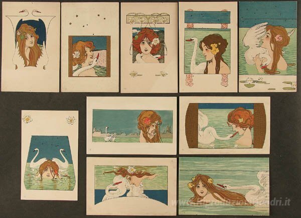 Ti offriamo una riproduzione artigianale su tela dell'opera famosa 'Leda e il cigno' di Raphael Kirchner, dal Museo delle Riproduzioni.