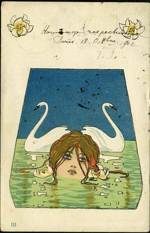Ti offriamo una riproduzione artigianale su tela dell'opera famosa 'Leda e il cigno' di Raphael Kirchner, dal Museo delle Riproduzioni.