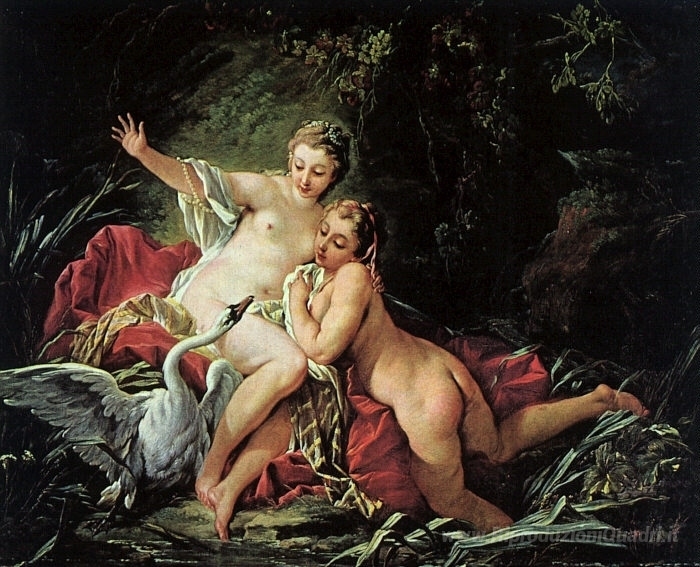 Ti offriamo una riproduzione artigianale su tela dell'opera famosa 'Leda e il cigno' di Francois Boucher, dal Museo delle Riproduzioni.
