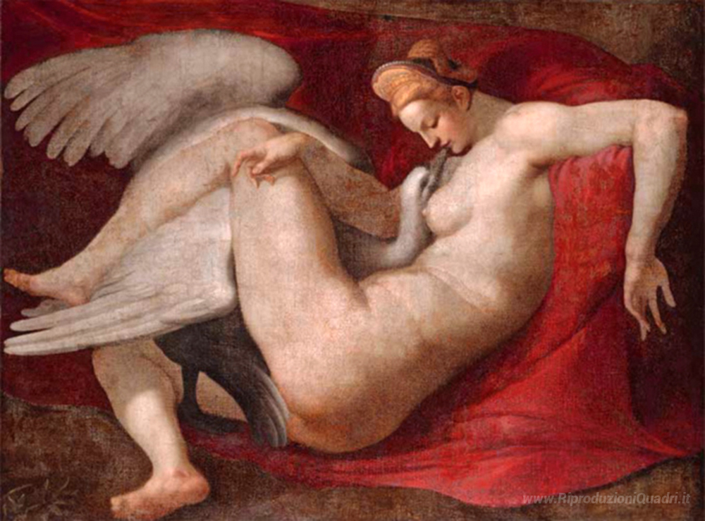 Ti offriamo una riproduzione artigianale su tela dell'opera famosa 'Leda e il cigno' di Michelangelo, dal Museo delle Riproduzioni.