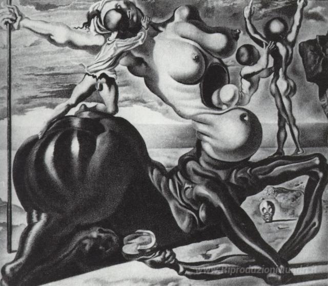 Ti offriamo una riproduzione artigianale su tela dell'opera famosa 'L'età d'oro - Famiglia di Marsupiale centauri' di Salvador Dali, dal Museo delle Riproduzioni.