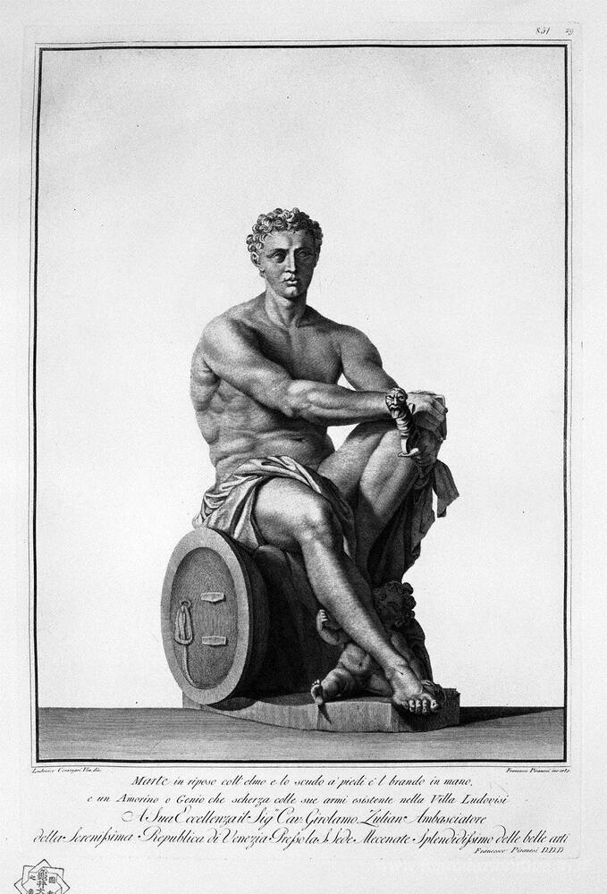 Ti offriamo una riproduzione artigianale su tela dell'opera famosa 'Mars seduti' di Giovanni Battista Piranesi, dal Museo delle Riproduzioni.