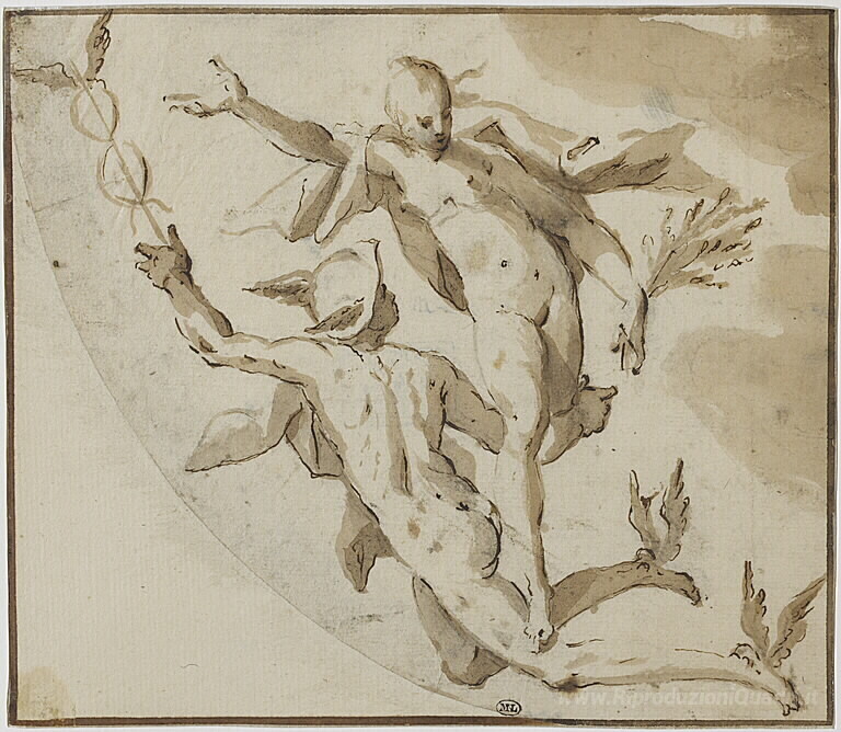 Ti offriamo una riproduzione artigianale su tela dell'opera famosa 'Mercurio e Cerere volare attraverso l'aria' di Hans von Aachen, dal Museo delle Riproduzioni.