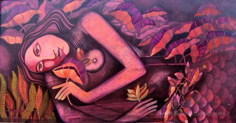 Ti offriamo una riproduzione artigianale su tela dell'opera famosa 'Mermaid in Lotus Pond IV' di Jahar Dasgupta, dal Museo delle Riproduzioni.