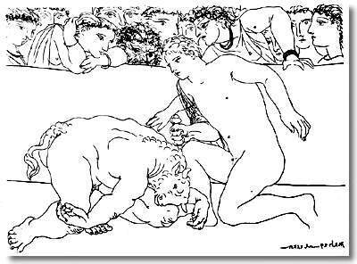 Ti offriamo una riproduzione artigianale su tela dell'opera famosa 'Minotauro è ferito' di Pablo Picasso, dal Museo delle Riproduzioni.