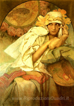 Ti offriamo una riproduzione artigianale su tela dell'opera famosa 'Musa' di Alphonse Mucha, dal Museo delle Riproduzioni.
