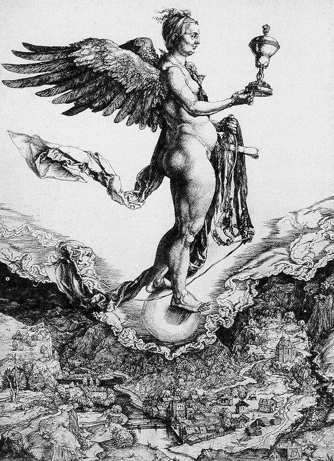 Ti offriamo una riproduzione artigianale su tela dell'opera famosa 'Nemesis (la grande fortuna)' di Albrecht Durer, dal Museo delle Riproduzioni.