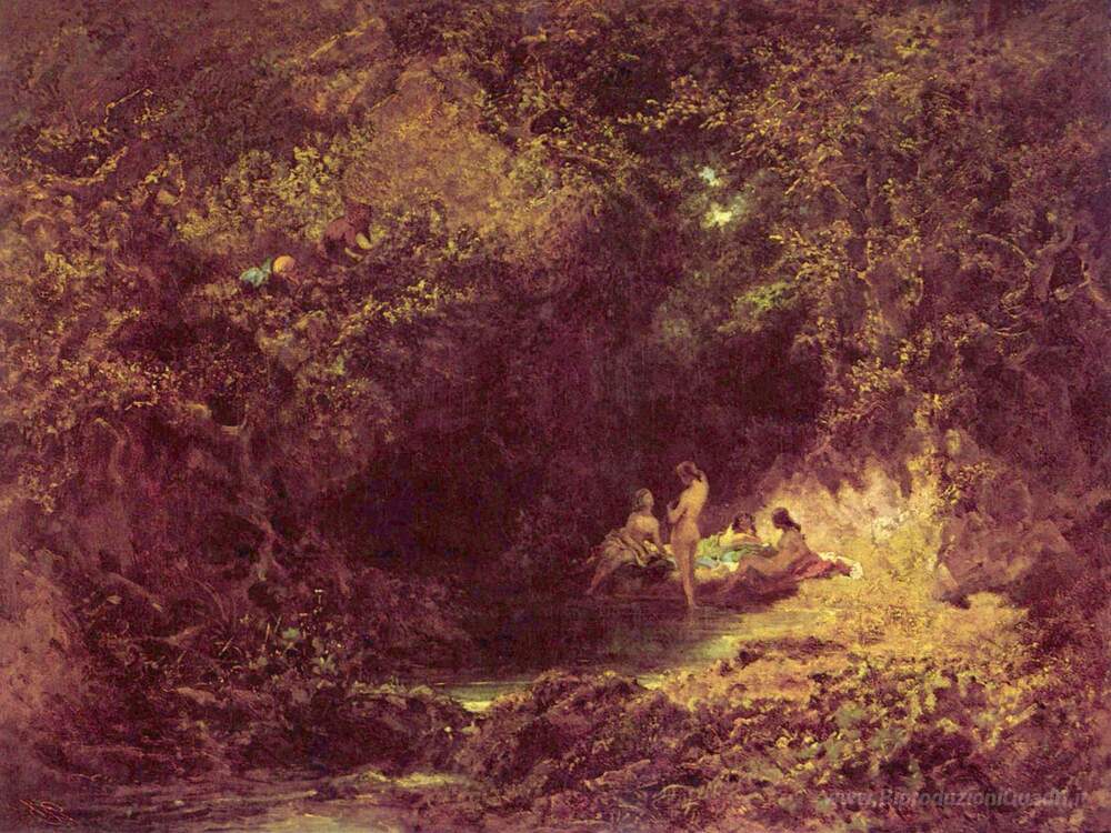 Ti offriamo una riproduzione artigianale su tela dell'opera famosa 'Ninfe di balneazione' di Carl Spitzweg, dal Museo delle Riproduzioni.
