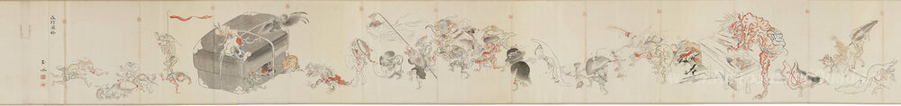 Ti offriamo una riproduzione artigianale su tela dell'opera famosa 'Notte marzo di un centinaio di demoni (metà sinistra)' di Tosa Mitsuoki, dal Museo delle Riproduzioni.