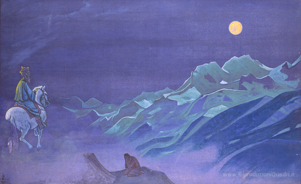 Ti offriamo una riproduzione artigianale su tela dell'opera famosa 'Oirot Messaggero del Burkhant Bianco' di Nicholas Roerich, dal Museo delle Riproduzioni.