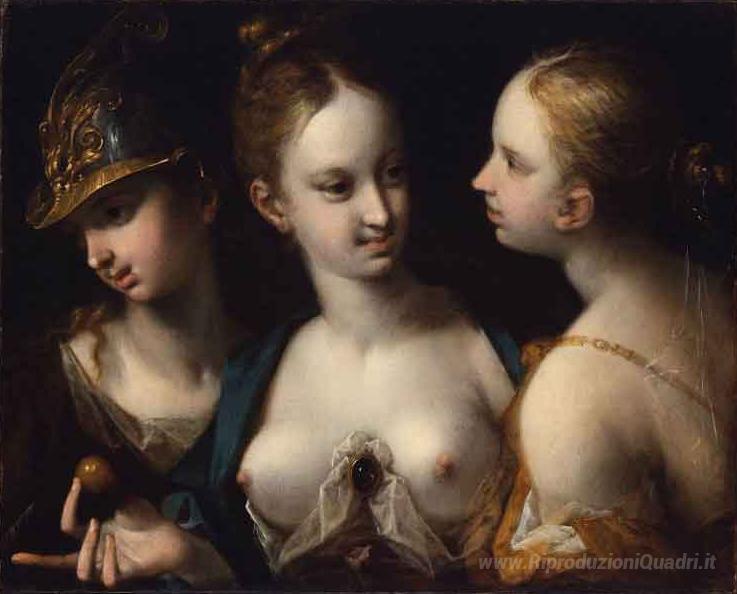 Ti offriamo una riproduzione artigianale su tela dell'opera famosa 'Pallade Atena, Venere e Giunone' di Hans von Aachen, dal Museo delle Riproduzioni.