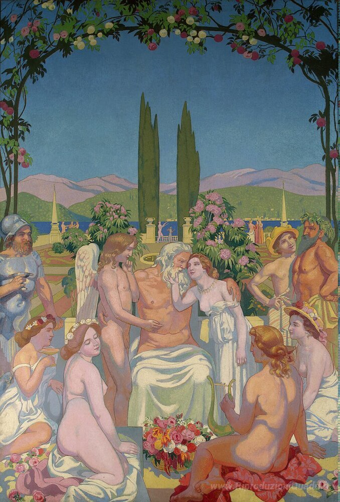 Ti offriamo una riproduzione artigianale su tela dell'opera famosa 'Pannello 5. In presenza degli dei Giove conferisce immortalità s' di Maurice Denis, dal Museo delle Riproduzioni.