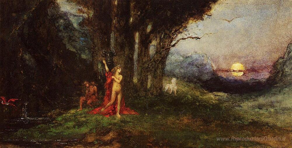 Ti offriamo una riproduzione artigianale su tela dell'opera famosa 'Pasifae e il Bul' di Gustave Moreau, dal Museo delle Riproduzioni.