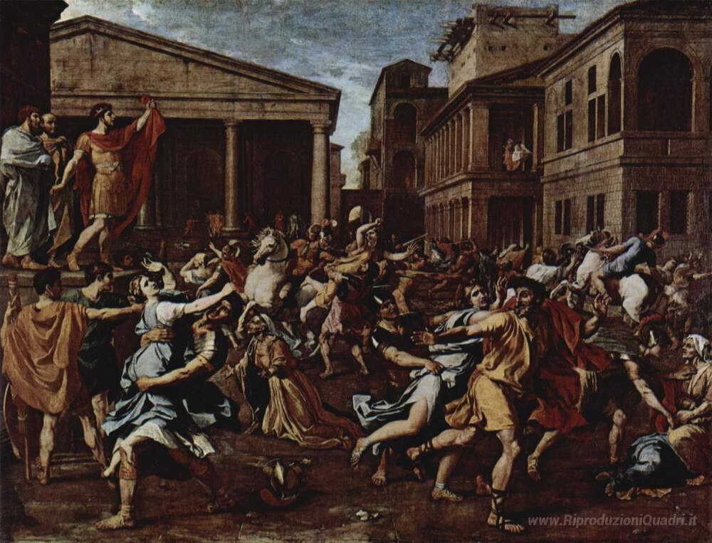 Ti offriamo una riproduzione artigianale su tela dell'opera famosa 'Ratto delle Sabine' di Nicolas Poussin, dal Museo delle Riproduzioni.