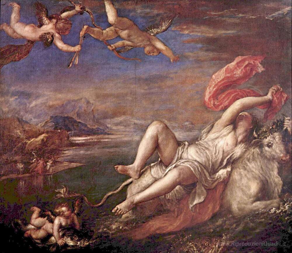 Ti offriamo una riproduzione artigianale su tela dell'opera famosa 'Ratto di Europa' di Titian, dal Museo delle Riproduzioni.