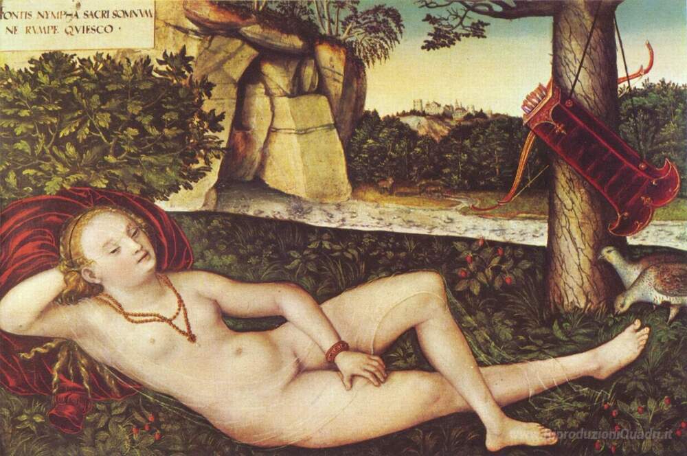 Ti offriamo una riproduzione artigianale su tela dell'opera famosa 'Reclining Diana' di Lucas Cranach the Elder, dal Museo delle Riproduzioni.