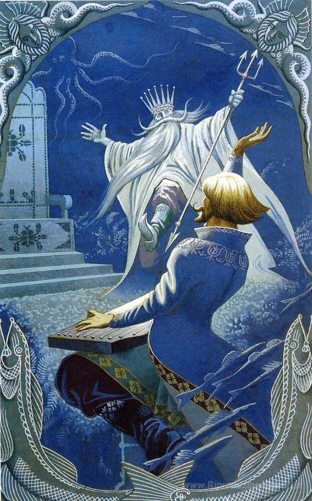 Ti offriamo una riproduzione artigianale su tela dell'opera famosa 'Sadko e Master Marine' di Konstantin Vasilyev, dal Museo delle Riproduzioni.