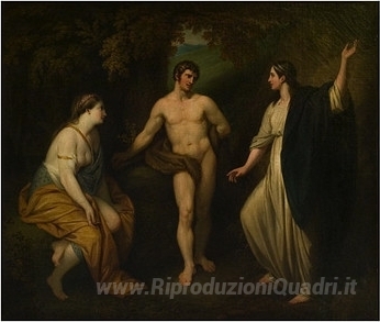 Ti offriamo una riproduzione artigianale su tela dell'opera famosa 'Scelta di Ercole tra virtù e piacere' di Benjamin West, dal Museo delle Riproduzioni.