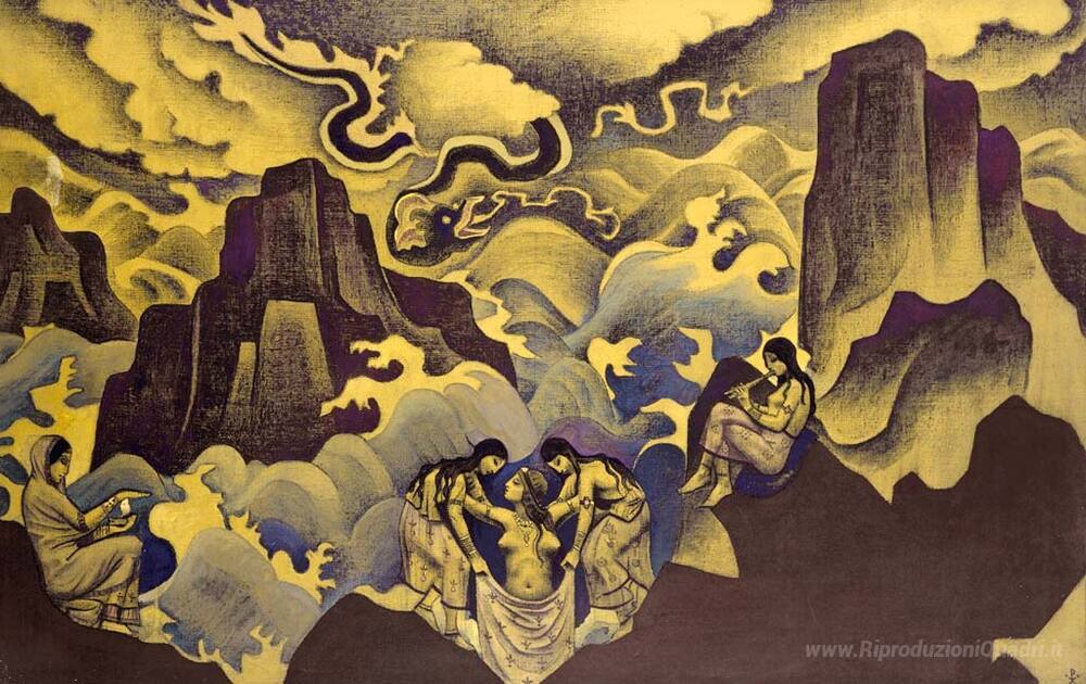 Ti offriamo una riproduzione artigianale su tela dell'opera famosa 'Serpente Antico (Serpente di Saggezza)' di Nicholas Roerich, dal Museo delle Riproduzioni.
