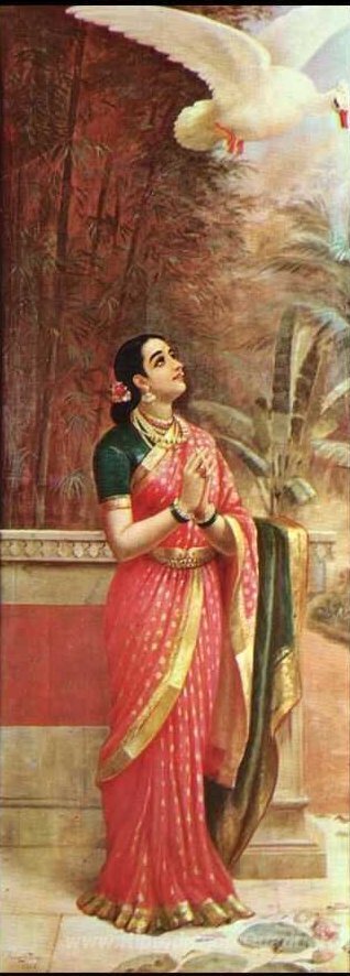 Ti offriamo una riproduzione artigianale su tela dell'opera famosa 'Swan messenger' di Raja Ravi Varma, dal Museo delle Riproduzioni.