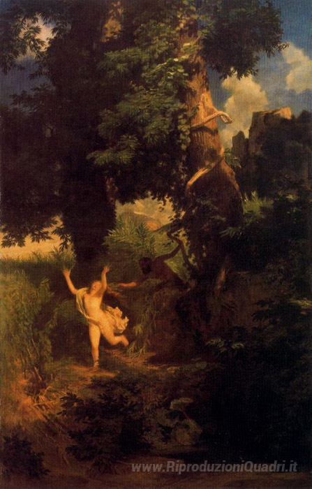 Ti offriamo una riproduzione artigianale su tela dell'opera famosa 'Syrinx in fuga dagli attacchi di Pan' di Arnold Böcklin, dal Museo delle Riproduzioni.
